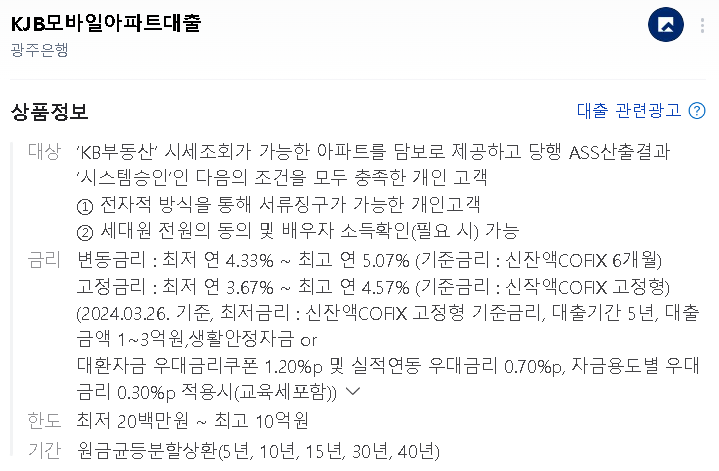 상품: KJB모바일아파트대출