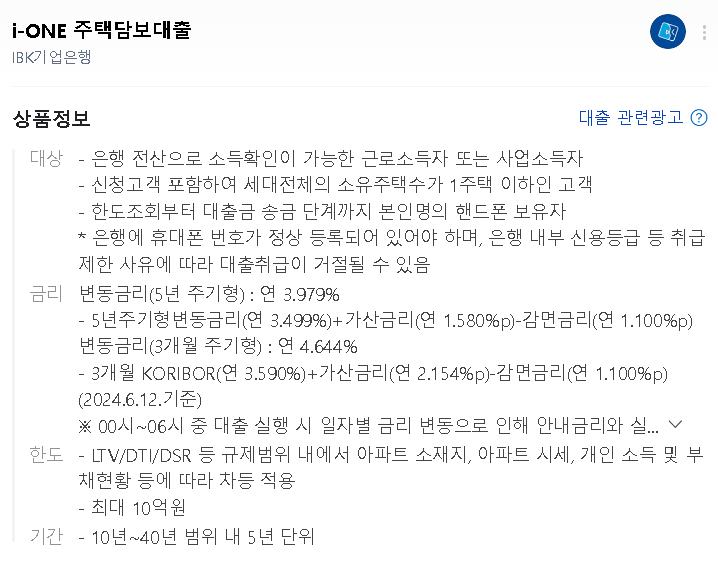 상품: i-ONE 주택담보대출