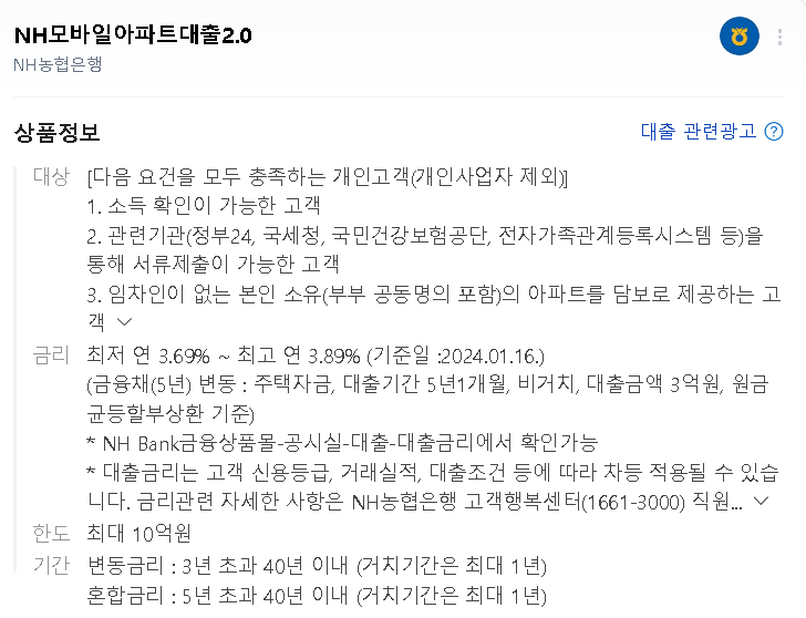 상품: NH모바일아파트대출2.0