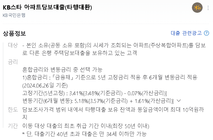 상품: KB스타 아파트담보대출(타행대환)